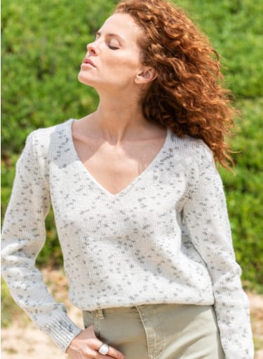 Un élégant pull simple à col V, sublimé par le fil fantaisie BONNIE. La jolie touche de brillance métallisée offre un aspect ultra féminin au modèle.