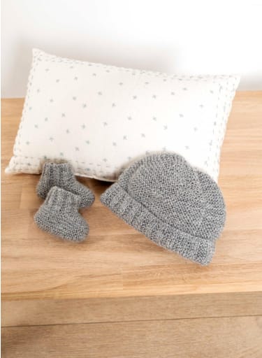 Ce joli ensemble composé d’un bonnet et des ses chaussons assortis est tricoté en fil CALINOU.
