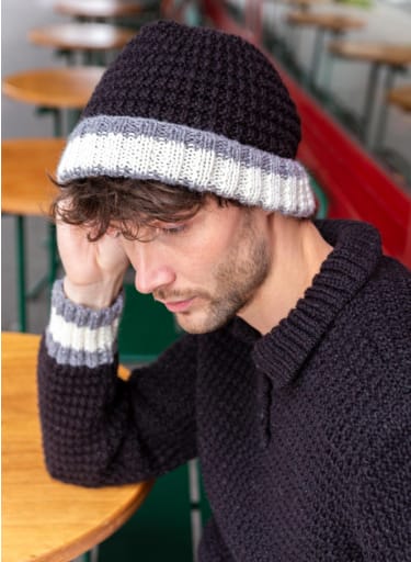 Joli bonnet à revers rayé tricoté en fil 100% RECYCLE 4 conçu à partir de fibres recyclées. Choisir ce fil c'est faire un pas pour la protection de la planète.